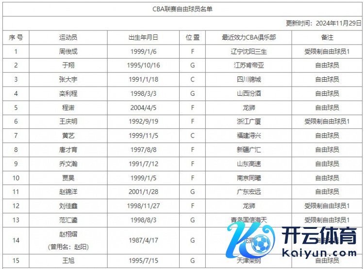 11月29日讯 今天,CBA官方更新了解放球员名单,此前效率于辽宁的周俊成在列,备注为受范围解放球员1。
